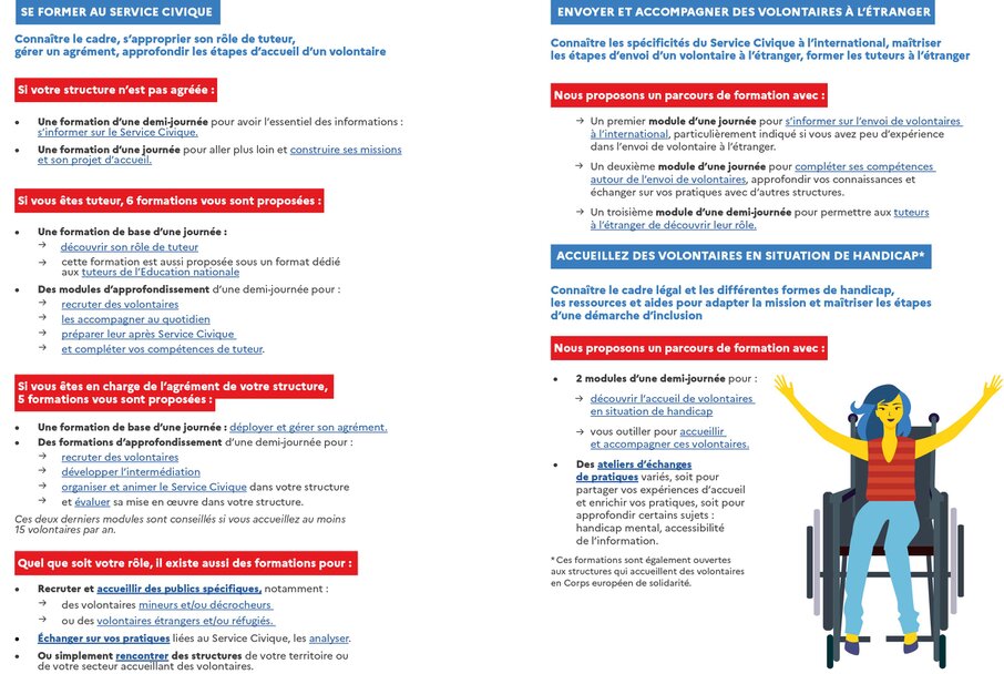 Pour cela, l'Agence du service civique, en collaboration avec les acteurs du “Groupement solidaire” spécialistes dans l’accueil de volontaires, vous proposent plusieurs formations gratuites.